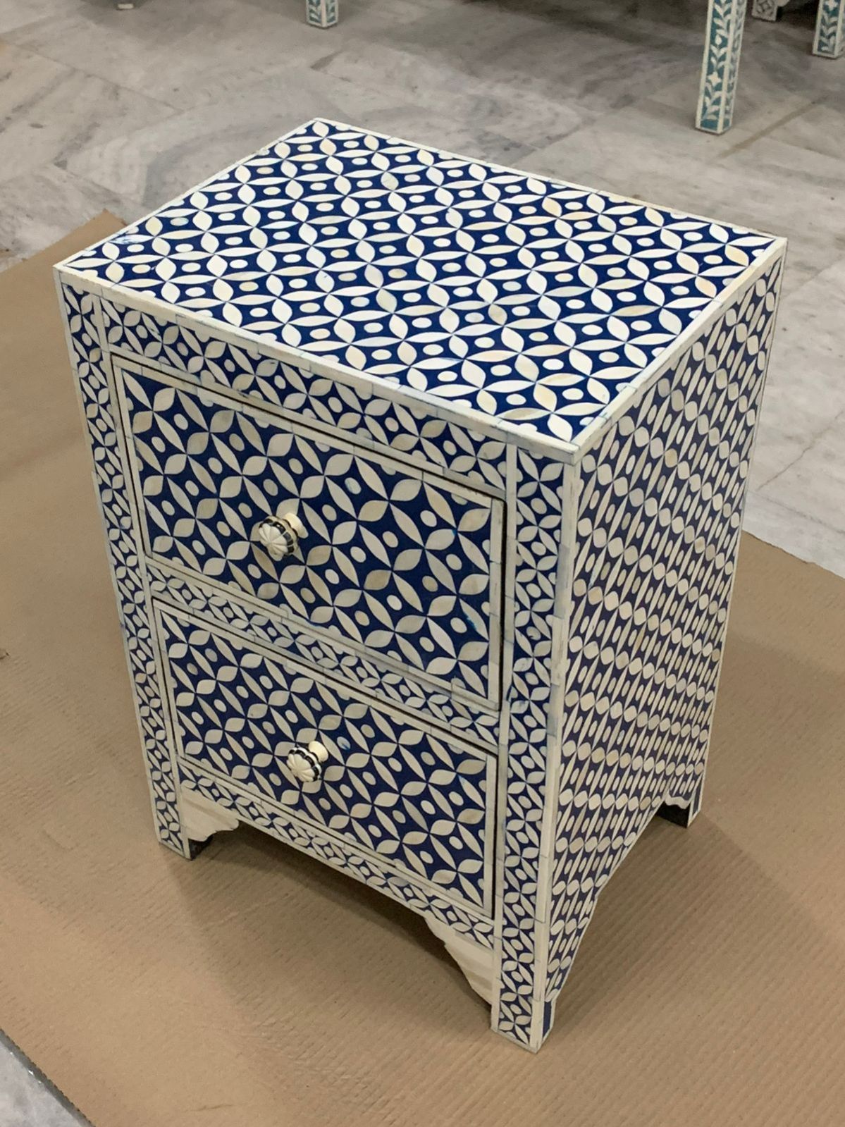 This stunning handmade bone inlay bedside table is crafted by skilled artisans using traditional bone inlay techniques. The table features a beautiful blue and white floral geometric pattern that adds a sophisticated decorative touch to any bedroom interior.
