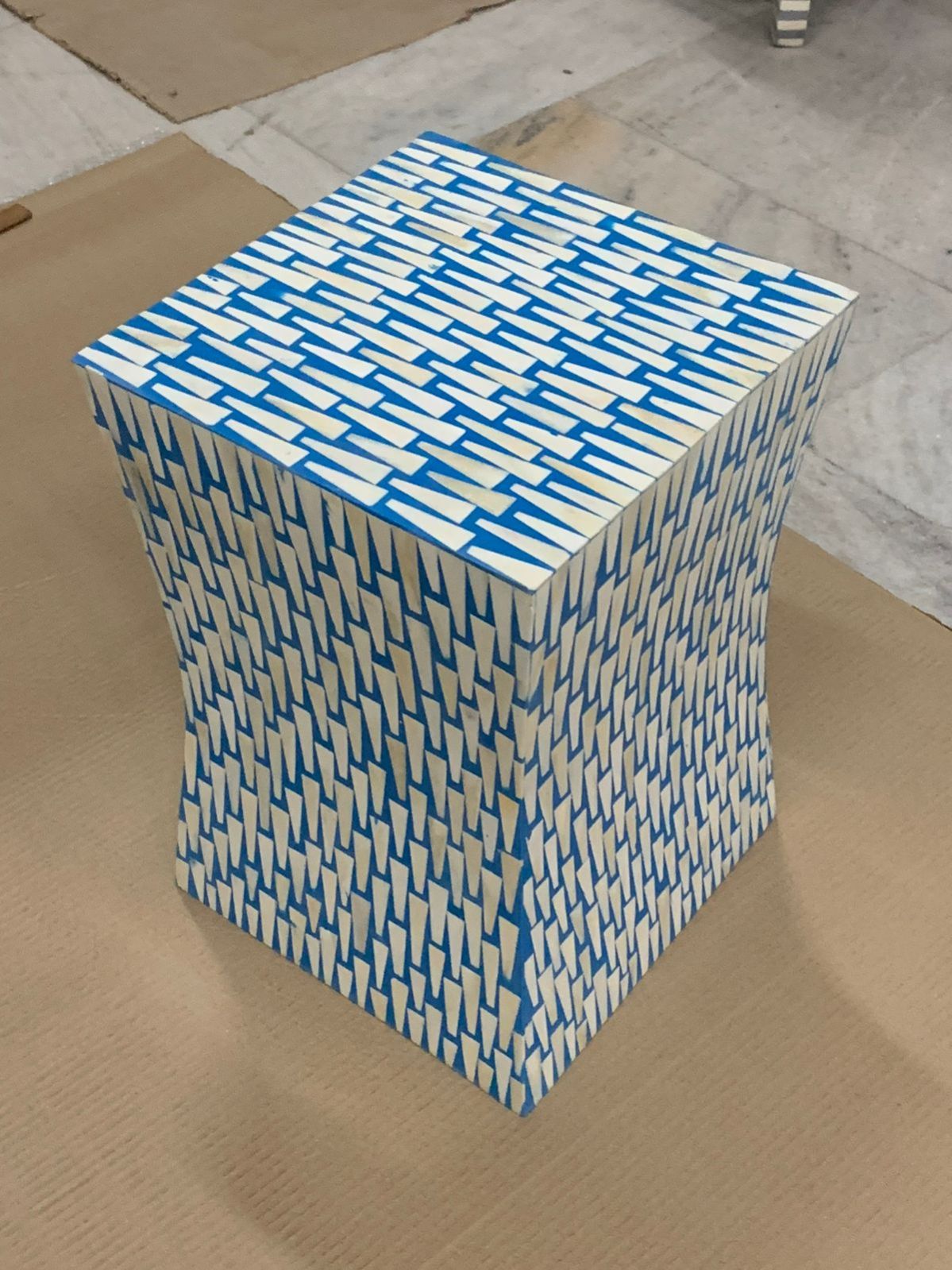 Stylish handcrafted blue bone inlay side table featuring a unique geometric pattern. This elegant accent table is perfect for living rooms, bedrooms, or lounge areas, adding a modern decorative touch to any interior.