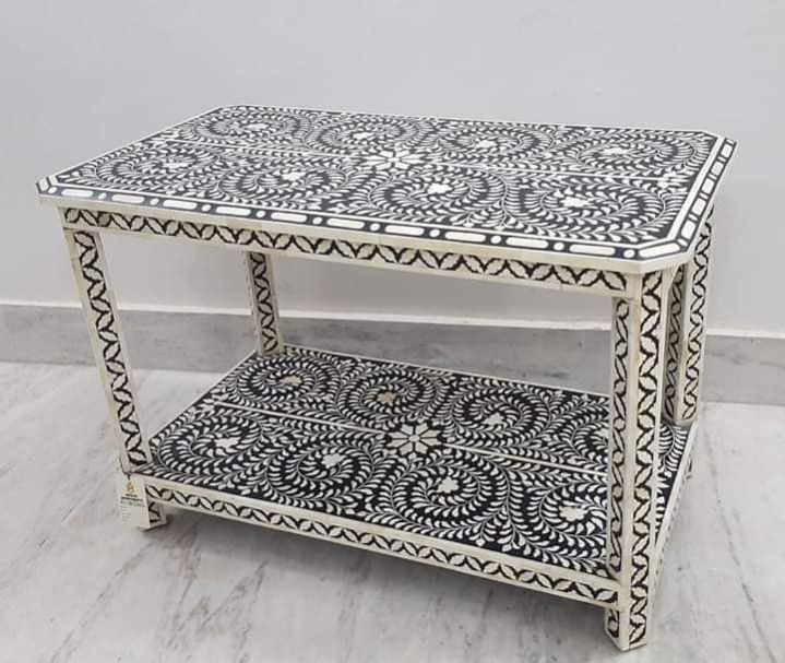 This stunning handmade bone inlay coffee table is crafted by skilled artisans using traditional inlay techniques. The table features a striking black floral bone inlay pattern that enhances the beauty of any interior décor.