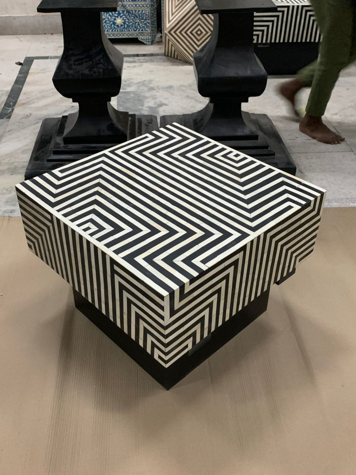Add a bold and artistic statement to your living space with this stunning Black Geometric Bone Inlay Coffee Table. Expertly handcrafted by skilled artisans in India, this table features a striking geometric bone inlay pattern set in a deep black resin background. The unique square design and intricate inlay work make this coffee table a perfect centerpiece for modern and contemporary interiors. Crafted from solid wood with detailed bone inlay craftsmanship, this table combines durability with timeless elegance. Ideal for living rooms, lounges, and luxury interiors, this handmade bone inlay coffee table showcases the beauty of traditional Indian handicraft with a modern geometric design.