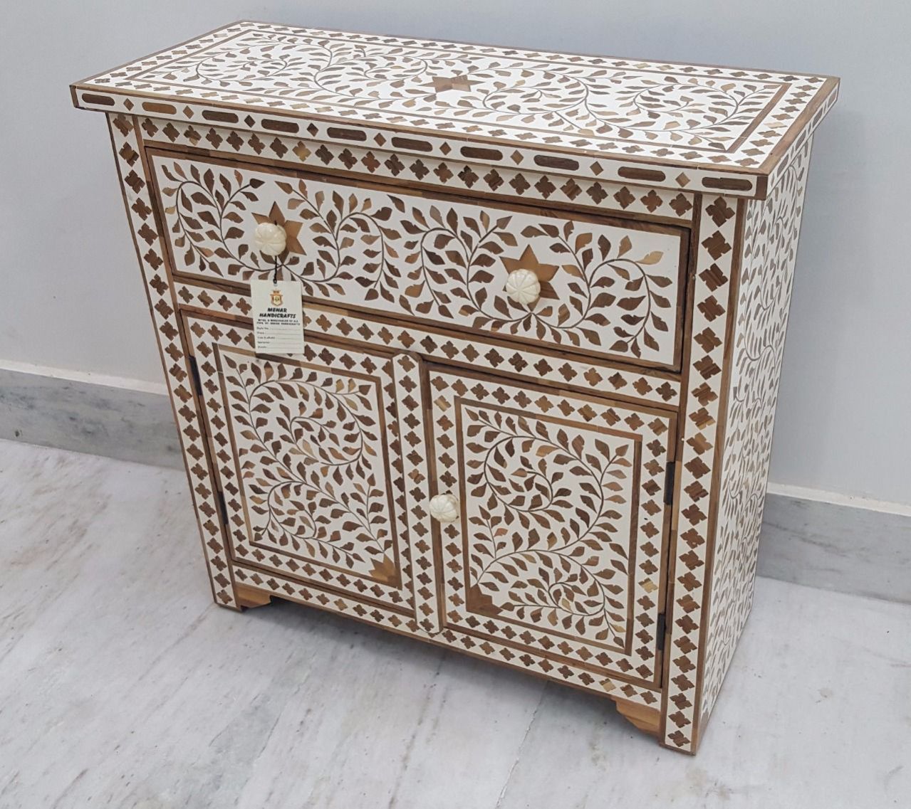 This beautifully handcrafted wooden bone inlay cabinet features intricate floral vine patterns created by skilled artisans. It adds a luxurious touch to any living room, bedroom, or hallway while offering practical storage space. Features: Material: Solid Wood with Bone Inlay Work Design: Handcrafted Floral Pattern Length: 90 cm (35 inches) Width: 40 cm (16 inches) Height: 85 cm (33 inches) Weight: Approx. 35–40 kg Storage: 2 Drawers & 2 Door Cabinet Finish: Natural Wood & Bone Inlay Finish Style: Handmade Artisan Furniture